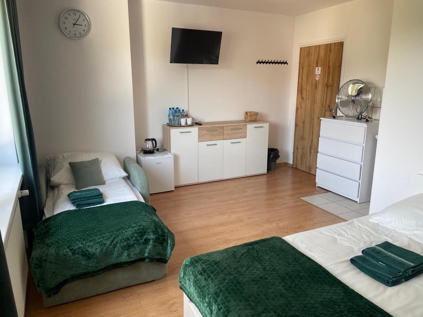 Pokój Trzyosobowy z prywatną łazienką. Providing free toiletries, this triple room includes a private bathroom with a shower, a hairdryer and slippers. This triple room features a tea and coffee maker, heating, a flat-screen TV and a balcony. The unit offers 2 beds. Pokój Trzyosobowy - 3 osobowy. Powierzchnia pokoju ok.: 12 mkw. ;